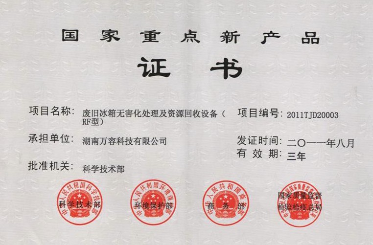 近日,beats365官网在线平台自主研发的废旧冰箱无害化处理及资源回收设备被国家科技部、环保部、商务部、质量监督检验检疫总局认定为国家重点新产品。 此项资质荣誉说明了有关部门对beats365官网在线平台该项产品的科技、质量、价...
