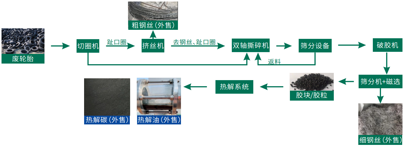 废轮胎 (废旧橡胶制品) 通过系列预处理系统, 将轮胎分离成钢丝、 胶粉, 钢丝外售, 胶粉通过进料系统送入热解系统, 最终形成热解炭、 热解油、 不凝气, 热解油、 热解碳作为能源产品外售, 不凝气全部用于热解供热系统燃烧供热。