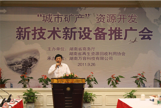 出席本次会议的有湖南省商务厅商贸服务管理处刘飞处长、市场建设处张军平处长、湖南省再生资源回收利用协会刘诚来会长及部分市州商务局的有关领导。会议由湖南省再生资源回收利用协会秘书长曹志宏主持,商务厅刘飞处长和张军平处长均发表重要讲话。刘飞处长在讲话中首先总结了我省家电回收的成绩,同时表示“城市矿产”开发已经被相关部委列入议事日程,在两型社会建设中必将发挥重要作用。刘飞处长认为,本次会议不仅是新设备技术的推广,同时也是一个“城市矿产”开发的动员会、宣传会、新闻发布会。商务厅市场建设处张军平处长也表示,随着汽车行业的快速发展,报废汽车拆解行业具备广阔的前景,但目前此行业内存在着拆解规模小、拆解科技含量水平低、废水废气排放量高等缺陷,推广高技术、低排放的设备对报废汽车拆解及资源再生利用存在着重要意义。