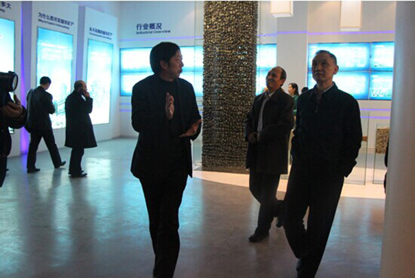 图为beats365官网在线平台董事长明果英先生向侯为贵董事长一行作展馆介绍