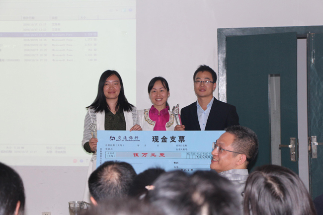 副总经理罗萍为伍亦雄、何钊颁发三季度“奋斗者标兵”奖杯及5万元现金支票