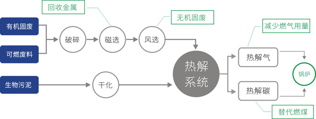采用无氧热解技术,实现废轮胎、塑料的物理化学回收,解决困扰世界难题的“白色污染”及“黑色污染”。针对废轮胎提供破碎分选设备、前端预处理及终端热解、废轮胎综合利用整厂系统服务。在安全、环保、连续稳定运行的前提下,废轮胎(废旧橡胶制品)最终转化为钢丝、热解油、热解碳,实现资源化、无害化、减量化处置。包装废塑料、分拣后城市垃圾、工业废塑料、农膜、纸厂垃圾等无法再进行直接利用,经破碎、分选、无氧热解后,最终转化为高热值的能源化产品热解油、热解碳,实现资源化、无害化、减量化处置。