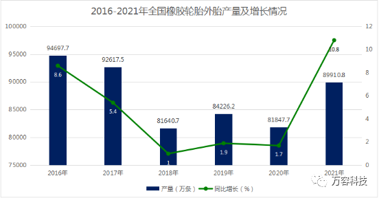 我国是世界的橡胶消耗国和橡胶进口国,也是世界的轮胎生产国。据统计局数据,我国橡胶轮胎外胎产量2020年、2021年分别为8.18亿条、8.99亿条,废旧轮胎产生量近2000万吨,而废轮胎无害化年处理率不足60%。