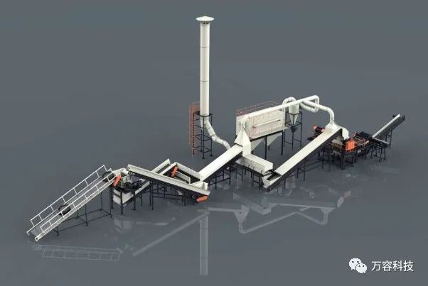 经过破碎等预处理的废轮胎转化为橡胶颗粒,在无氧工况下,当温度达到400-600摄氏度,橡胶颗粒中主链具有不饱和键的高分子,在热化学反应后发生断裂,回到小分子或单体状态,产出热解气、热解炭、钢丝,不可冷凝的气体进入燃烧室燃烧供热,燃烧的高温烟气通过热解主炉吸收大部分热能后进入后端烟气系统处理后达标排放,可冷凝气体形成热解油。
