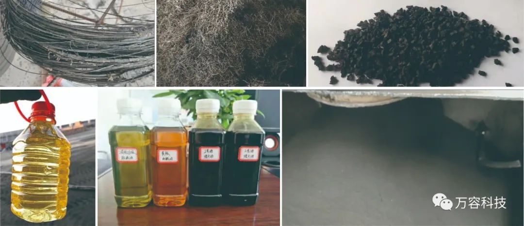 废轮胎经热解处理后可以有效回收炭黑、富含芳烃的油和高热值燃料气,实现能源的回收和资源的充分再利用。热解后的轮胎油主要成分为烷烃、烯烃、苯、甲苯、二甲苯、苯乙烯及稠环芳烃,具有粘度低、轻质馏分油含量高的优点,可广泛适用于钢铁厂、锅炉加热、重油发电机、水泥厂等工业燃料用油;也可精炼为柴油,应用于卡车、柴油发电机、船用汽轮机、重型机械燃料油或作炼油厂原料油;废轮胎热解后的炭黑是黑色粉末固体状,经济价值高于石油内的炭黑,可增强橡胶的产品强度、耐用性和着色性能,可作为轮胎制造、电缆、胶辊、传送带及其他橡塑制品的补强剂和填充剂,如透气塑胶跑道等;也可制成球状炭黑或炭黑煤球用于加热燃烧,热值与煤相当;也可进行深加工磨粉或加工成色母卖至塑料行业着色,除此之外,炭黑还有很多用途,例如铺路等等,利用价值非常大;而预处理提取的废轮胎钢丝,除了直接卖掉,还可以回炉炼钢或再加工成钢丝切丸,用于造船厂、打磨器材除锈等,利润比直接卖钢丝翻倍赚。