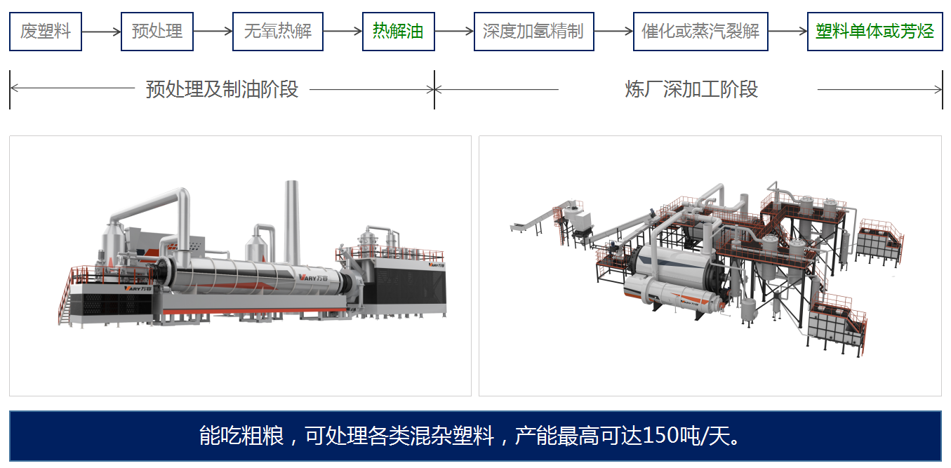 采用无氧热解技术,实现废轮胎、塑料的物理化学回收,解决困扰世界难题的“白色污染”及“黑色污染”。针对废轮胎提供破碎分选设备、前端预处理及终端热解、废轮胎综合利用整厂系统服务。在安全、环保、连续稳定运行的前提下,废轮胎(废旧橡胶制品)最终转化为钢丝、热解油、热解碳,实现资源化、无害化、减量化处置。包装废塑料、分拣后城市垃圾、工业废塑料、农膜、纸厂垃圾等无法再进行直接利用,经破碎、分选、无氧热解后,最终转化为高热值的能源化产品热解油、热解碳,实现资源化、无害化、减量化处置。